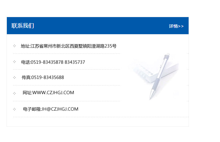 傳真:0519-83435688    郵編:213135    網址:WWW.czjhgj_com.sdrsbl.com    電子郵箱:JH@czjhgj_com.sdrsbl.com